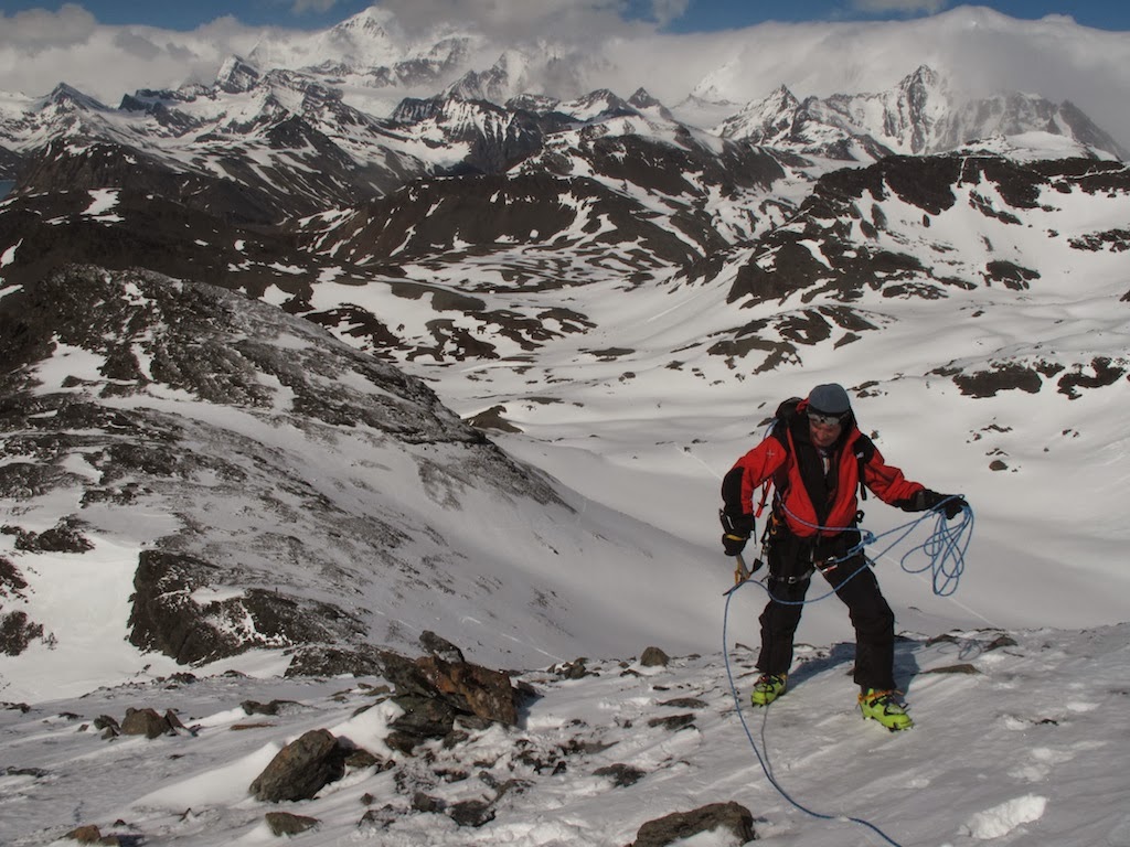 Skiing with a sled carrying the kind of gear you need to sit out a hurricane-force storm is hot work, so I gave a lot of thought about what to wear. I wanted a system that would cool me down skiing in the sun, but would warm me up quickly when necessary, was wind-resistant, quick drying and hard wearing. I really didn’t want to be messing around with layers. Wearing a climbing harness and carrying a rucksack that’s clipped to a sled, it just isn’t practical to take clothes off.
